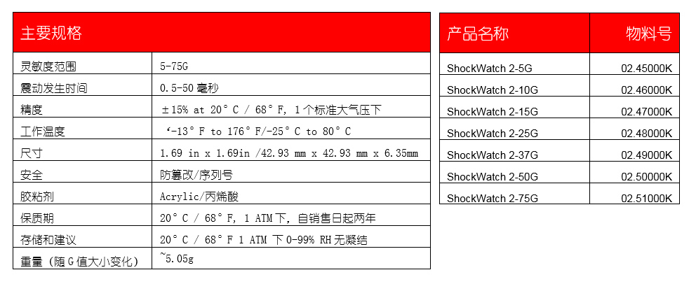 要開始選擇ShockWatch 2沖擊指示器靈敏度,您需要知道兩件事:貨物大小和重量。選擇指南只是作為一個參考。實際使用還要考慮到產(chǎn)品的易損性和包裝情況,來選擇具體規(guī)格和相應(yīng)G值的標(biāo)簽。更脆弱的產(chǎn)品可能需要更敏感(低G)的型號,而包裝更堅固的產(chǎn)品可能需要更不敏感(高G)的型號。